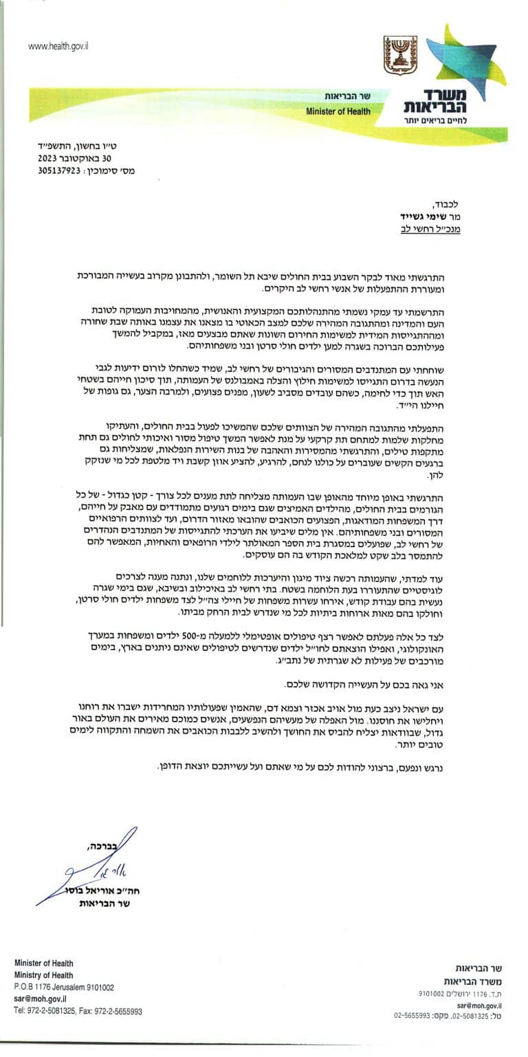 שר הבריאות חה"כ אוריאל בוסו - מכתב לרחשי לב - מלחמת חרבות ברזל